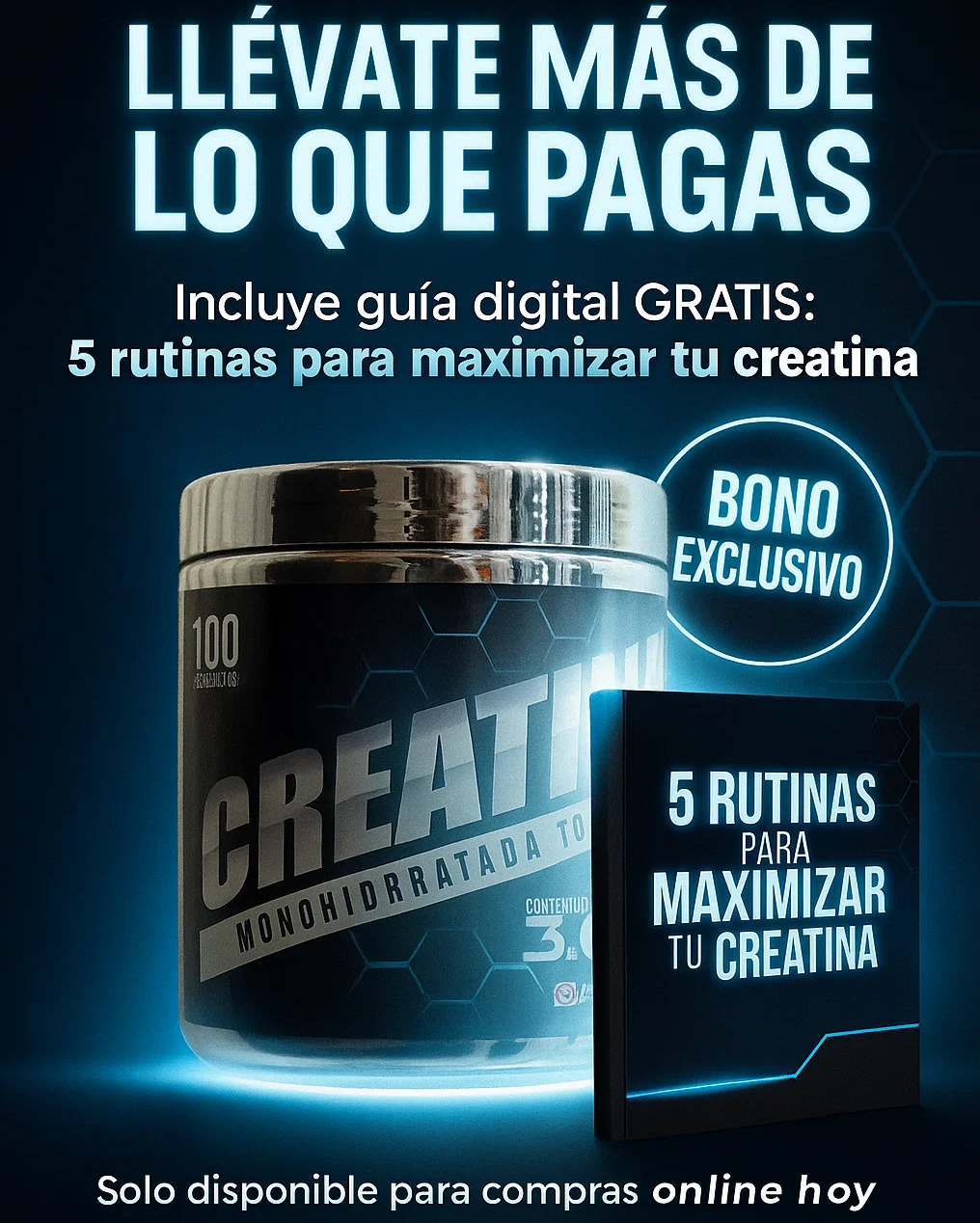 *Gracias a su pureza del 99.8%, nuestra creatina te ayuda a ganar fuerza y volumen real sin usar anabólicos. Es un suplemento natural, probado y seguro que mejora tu rendimiento y acelera tus resultados sin dañar tu salud.